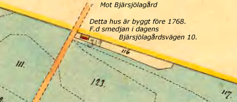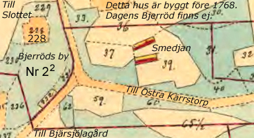 Smeden Cederberg (Skatte Rusthåll). Har stugulängan i ganska gott stånd ävensom uthusen men har ej någon hage och ej heller plantering. Husen, byggda före 1768, ligger på äga nr 39. Behöver ej flytta. Bjärröd Nr X på gamla kartan 1768. Ägor: Åker nr 26, 33, 36, 37, 52, 63, 651/2. Äng nr 30, 31, 42, 48, 50, 51, 62,66. Gatumark nr 38, 40, 41, 55, 58, 60, 61 (invid smedjan). ![]() ![]() |