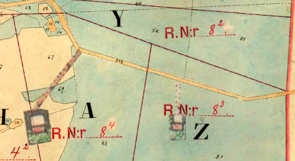 Åboen Nils Nilsson (Skatte Rusthåll). Har gården i sämre stånd, utan hage och plantering. (15 Binningar, värde 135 Rd, 9 Rd/binning). Husen, byggda efter 1768 (var?), ligger på äga nr ej angivet. Har utflyttningsskyldighet till ägorna nedan. Det finns inget hus på dessa ägor 1916. Ägor: Äng nr 15-17, 43, 44. ![]() |