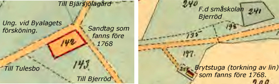 Åboen Anders Jönsson (Skatte Rusthåll). Har stugulängan i gott stånd och en uthuslänga i passabelt stånd. (Ej värderat). Har tvenne trädgårdar med många frukt och vilda träd. Husen, byggda efter 1768, ligger på äga nr 228. Behöver ej flytta. På kartan till höger, 1768 Bjärröd Nr 2. Ägor: Åker nr 224, 225. Äng nr 217, 223, 229, 230. Gatumark nr 227, 231 ![]() ![]() |