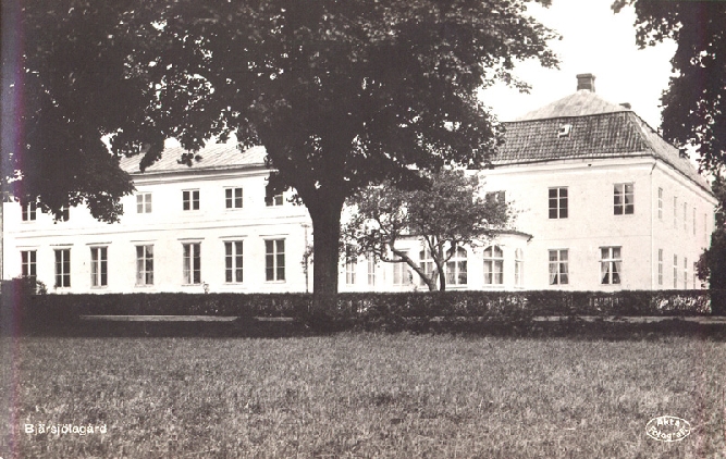 | Nyutgåva, runt 1960, av Bjärsjölagårds Gård (Slottet) mot landsvägen 1911 eller något år därefter. Notera häcken mot landsvägen. |