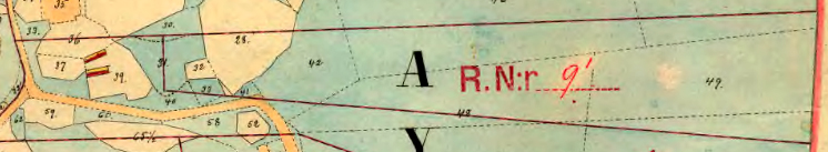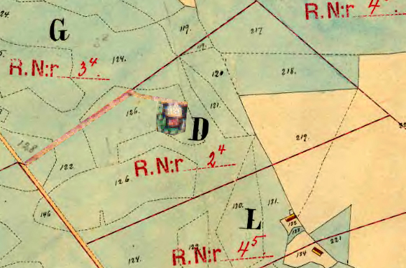 Åboen Nils Nilsson (Skatte Rusthåll). Har gården i sämre stånd, utan hage och plantering. (15 Binningar, värde 135 Rd, 9 Rd/binning). Husen, byggda efter 1768 (var?), ligger på äga nr ej angivet. Har utflyttningsskyldighet till ägorna nedan. Det finns inget hus på dessa ägor 1916. Ägor: Äng nr 15-17, 43, 44. ![]() |