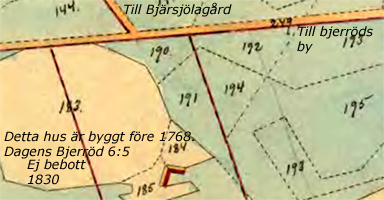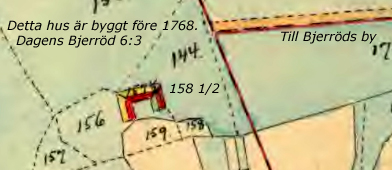 Åboen Hans Olsson (Skatte Rusthåll). Har en stugulänga i passabelt stånd och en uthuslänga även passabel. (10 Binningar, värde 60 Rd, 6 Rd/binning) Husen, byggda efter 1768, ligger på äga Bjärröd Nr 2 gamla kartan 1768. Har utflyttningsskyldighet till ägorna nedan, befintliga hus flyttas dit. Huset byggdes vid krysset. Ägor: Odlingsmark nr 144-146, 150-154.