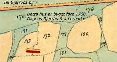 Mjölnaren Jöns Sjöberg (Skatte Rusthåll). Har gården i gott stånd med en större fruktträdplantering av vilda träd. Huset, byggt efter 1768, ligger på äga nr 76. Bjärröd Nr 7 gamla kartan 1768. Behöver ej flytta. Ägor: Åker nr 67, 77, 78, 202, 203, 206, 207, 2161/2. Äng nr 74, 75, 79, 80, 201, 204, 205, 208, 212-216, Gatumark nr 55, 70. Sandtag nr 205 ![]() ![]() |