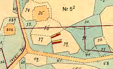 Smeden Cederberg (Skatte Rusthåll). Har stugulängan i ganska gott stånd ävensom uthusen men har ej någon hage och ej heller plantering. Husen, byggda före 1768, ligger på äga nr 39. Behöver ej flytta. Bjärröd Nr X på gamla kartan 1768. Ägor: Åker nr 26, 33, 36, 37, 52, 63, 651/2. Äng nr 30, 31, 42, 48, 50, 51, 62,66. Gatumark nr 38, 40, 41, 55, 58, 60, 61 (invid smedjan). ![]() ![]() |