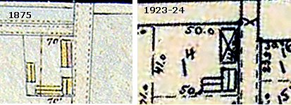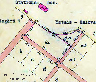 4A. Huset mitt emot "Textilboden" Se kartan till vänster och mitten under punkt 2 ovan. 1875 låg huset i nord-sydlig riktning, 1923 i öst-västlig riktning. PÅ en karta från 1910 ligger huset fortfarande i nord-sydlig riktning. Köptes av Ystad-Eslövs järnvägsaktiebolag inklusive huset 1924, se under punkt 12 nedan. Här startade senare Lars Persson Vollsjötofflor. Årtal inte känt. Huset troligen byggt samtidigt som husen norr om järnvägen 1865, revs 19xx då ett nytt hus byggdes. |