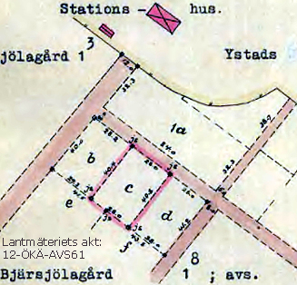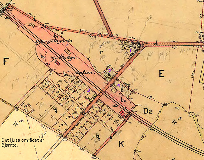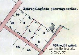 Gårds ägor. För att kunna se bättre så gå till Lantmäteriet, Historiska Kartor, Sjöbo, Bjärsjölagård, 12-ÖKÄ-169. ![]() Husen i Bjärsjölagård 1923 var endast de som är markerade, 1-4, med blåa siffror övre bilden. Nedan märkta 1A-4A. Övriga hus som syns med rödaktig bakgrund tillhörde Järnvägsbolaget. 1A. Husen i korsningen. ![]() Huset mitt i korsningen byggdes före 1875 men efter 1851 när dåvarande hus revs. Var under en tid gårdssmedja under Bjärsjölagård. Smedjan brann ned 1938. De två husen längs med Brunnslövsvägen byggdes samtidigt, de fanns inte 1851 och 1865 men 1875. Sista huset längs Bjärsjölagårdsvägen fanns inte 1875, byggår f.n. okänt finns dock med på en karta från 1915. |