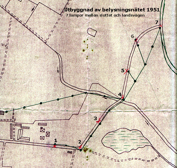 Bjärsjölagård. Man kan väl antaga att före detta möte fanns ingen gatubelysning i Bjärsjölagårds samhälle. Det går inte heller att se på foton före denna tid om det fanns någon belysning. Det nämns i ett av styrelseprotokollen (1938-06-29) att det fanns en Andelselektricitetsförening som innehar kontrakt med Sydsvenska Kraftaktiebolaget så det är möjligt att det redan fanns viss gatubelysning. Läs här MS-artikeln 1936, rubrik Bjärsjölagårds sällskapsklubb! Materialet som redovisas nedan har ställts till förfogande av Hans Molin. Läs här, dokument om utbyggnaden av Bjärsjölagårds gatubelysningsnät 1950-1951. Inga gatubelysningskartor har f.n. hittats så det är svårt att veta hur gatubelysningen verkligen såg ut eller hur många lampor det fanns. Från protokollen kan utläsas att det kunde finnas följande antal lampor: 1938, på nuvarande Bjärsjölagårdsvägen, 8 st. 1941, släcktes halva antalet lampor, kvar tända, blev de vid Kvarnen, Kristina Perssons, Johan Nilssons och Bjärrödsvägen. Släckta de vid Björcks, Kooperativa + 2 till icke namngivna. 1946, 2 lampor installeras på Bjärrödsvägen nr 2 och nr 6. 1946, 2 lampor installeras på Tullesbovägen, i centrum av vägbanan, var anges ej. 1946, 1 lampa installeras vid brandstationen och 1 i norra området (Johan Hanssons). 1950, 13 nya lampor, placering enligt överenskommelse med Andersson. 1951, ny armatur i sto1pe 121 och 123 samt förlängd arm i stolpe 80, dennes lampa flyttas till stolpe 57a. 1951, 7 st lampor mellan Slottet och landsvägen Sjöbo-Hörby enligt karta. (Se här). |