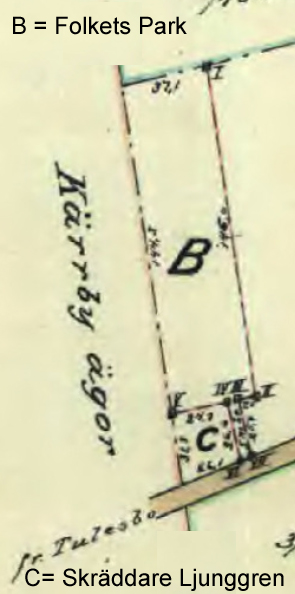 med följande utvisade gränser:Den östra sidans gräns utgöres av den utav skräddare Ljunggren inköpta tomten närmare markerad av en bokehäck. Södra och västra gränserna utgöres av rågångarna mot Kärrby och Bjärsjölagård Gårds ägor. Norra gränsen utgöres av en linje paralellt med södra gränsen från sydvästra gaveln av det boningshus skräddare Ljunggren nu bebor och mot västra gränsen. Dessutom inbegripes i denna försäljning ett område avsett till väg till det större jordområdet. Wägområdet utgöres av 5 meter i bredd utmed norra sidan av skräddare Ljunggrens tomt till allmänna vägen. För dessa båda jordområden betingar jag mig en köpesumma av fyratusen (4000) kronor som erlägges med 1000 kronor i dag vid detta köps underskrivande, 1000 kronor den 1ste november detta år, 1000 kr den 1ste juli 1920 och 1000 kr den 1ste juli 1921. Ogulden köpeskilling förräntas med 6 % från tillträdesdagen som bliver den 14de mars detta år. Den på jordområdena i fråga belöpande skatter utgöres från tillträdesdagen av köparen som även har att bestrida alla med detta köp förenade lantmäteri- och lagfartskostnader. All rätt till torvskiftet undantages detta köp och tillfaller stamhemmanet. Köparen förbinder sig att ej å jordområdet i fråga, som nu försålts, driva speceri- eller därmed jämförlig handelsaffär. Däremot stånde det köparen att fritt idka Kafe-rörelse och basarnöje. Skulle det oaktat köparen bedriva handelsaffär hava dessa att till innehavaren av handelslägenheten å stamhemmanet att som skadestånd utgiva den ersättning som kan i fråga komma. Särskilt köpebrev utgives så snart nådiga åtkomsthandlingar kunna anskaffas och köparen med förbindelser eller annorledes erlagt köpesumman. Bjärröd Bjärsjölagård 2/2 1919. Johan A. Jönsson Med förestående kontrakt förklarar vi oss (styrelsen) för Folkets hus föreningen u.p.a. nöjda samt till alla delar uppfylla. Nils Levin ordförande, G. Sterner kassör. Köpares pxh säljares namtekningar bevittnas. På en gång närvarande vittnen. Anders Hansson E.J. Arthur Grönqvist. Vidimeras ex officio Ragnar Krebin". |