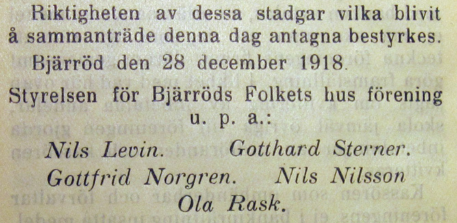 Registrering av tomten (Citat, Lantmäteriets akt 12-ÖKÄ-159, sid.6 ) "Afskrift. I enlighet med här förda föreningsregister vardar till bevis meddelat, att Bjerröds Folketshusförening utan personlig ansvarighet den 20 i denna månad härstädes registrerats, att styrelsen, som har sitt säte i Bjerröd av Östra Kärrstorps socken utgöres av Nils Levin, Gotthard Sterner, Gottfrid Norgren, Nils Nilsson och Ola Rask, alla i Bjärsjölagård, med Anders Frid i Kärrby, Nils Jönsson i Tulesbo och Theodor Ohlsson i Bjärsjölagård som suppleanter samt att Nils Levin och Gotthard Sterner gemensamt teckna föreningens firma. Malmö i landskansliet den 24 maj 1919. På tjänstens vägnar T. Kinnuen. Vidimeras (med två namnteckningar)". (Läs här båda dokumenten). |