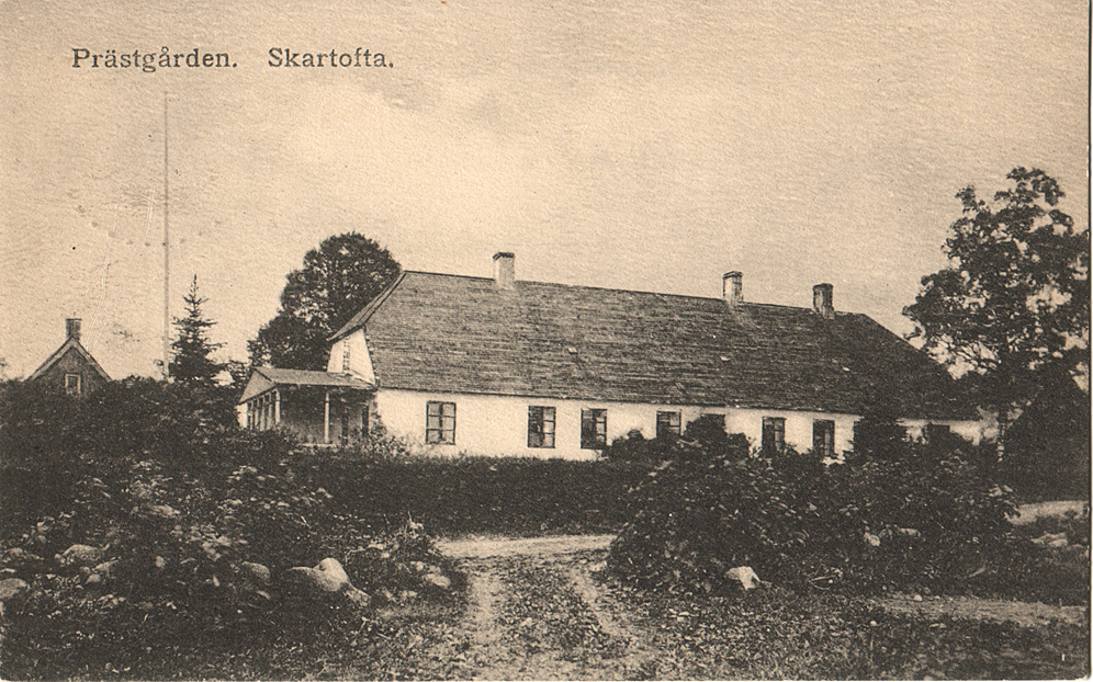 ![]() Prästgården, 1914, som blev byggd 1801, 5 år innan kyrkan blev nedlagd. Vykort som skickats av Anna Nordstrand, 14 år gammal och dotter till prästen Axel Herman. Hon nämner bl.a. att de har telefonnummer Östraby 20 b. | |