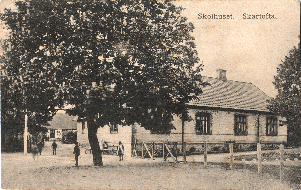 1794 är första gången som Skolhuset nämns i kyrkböckerna. Lärare då är Johan Jeansson.Vid Laga Skifte 1834 tilldelades den nya skolan mark enligt protokollet paragraf 5,citat: "Till plats för Skole och fattighuset uttogs gamla kykogården och 2 kappeland jord öster derintill o varande härvid det vilkor fattat att i händelse, då verbörlig förfrågan skett det icke skulle bli beviljat att i stället för den till Magasin ämnade gamla Skartofta kyrka få inrätta Skole och fattighus så kommer fråndeles plats dertill att uttagas på Kärrby ägor vid vägen i No 266." Anm:Skolan invigdes den 1 sep. 1839. Anm: 2 kappland = 308,54 m2. | |